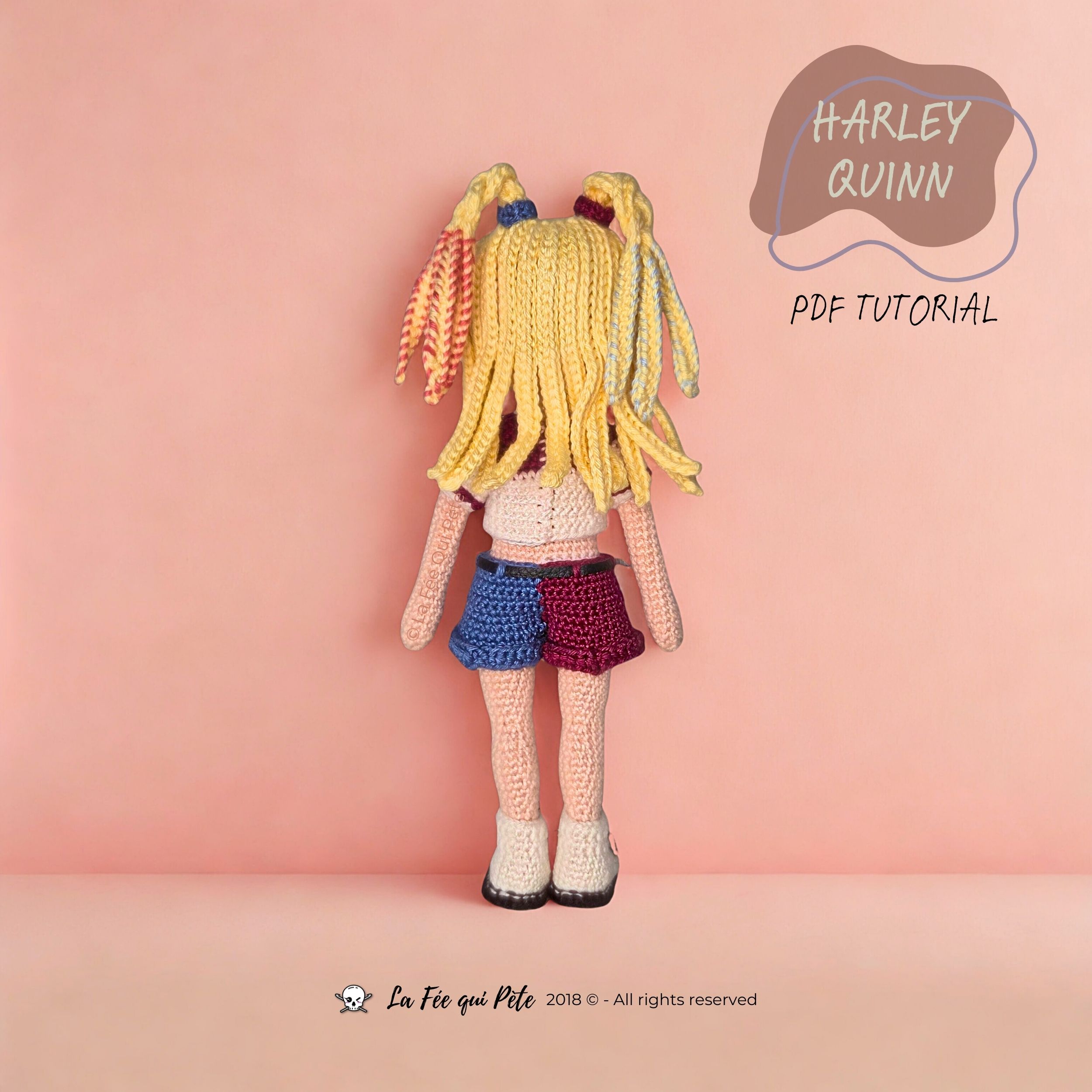 Tutoriel PDF pour crocheter une poupée amigurumi Harley Quinn d’environ 23 cm.